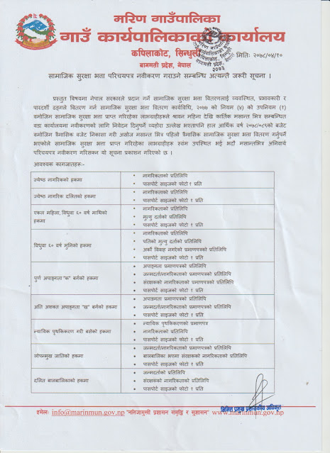 प्रस्तुत विषयमा नेपाल सरकारले प्रदान गर्ने सामाजिक सुरक्षा भत्ता वितरणलार्इ व्यवस्थित, प्रभावकारी र पारदर्शी ढङ्गले वितरण गर्न सामाजिक सुरक्षा भत्ता वितरण कार्यविधि, २०७७ को नियम (४) को उपनियम (१) वमोजिम सामाजिक सुरक्षा भत्ता प्राप्त गरिरहेका लाभग्राहीहरूले श्रावन महिना देखि कार्तिक मसान्त भित्र सम्बन्धित वडा कार्यालयमा नवीकरणको लागि निवेदन दिनुपर्ने व्यहोरा उल्लेख भएतापनि हाल आर्थिक वर्ष २०७८/०८९को बजेट वमोजिम त्रैमासिक वजेट निकासा गरी असोज मसान्त भित्र पहिलो त्रैमासिक सामाजिक सुरक्षा भत्ता वितरण गर्नुपर्ने भएकोले सामाजिक सुरक्षा भत्ता प्राप्त गरिरहेका लाभग्राहीहरू स्वंम उपस्थित भर्इ भदौ मसान्तभित्र अनिवार्य परिचयपत्र नवीकरण गरिसक्न यो सूचना प्रकाशन गरिएको छ ।
